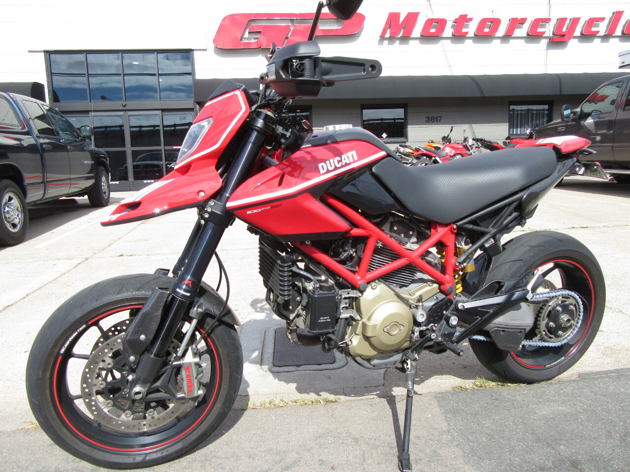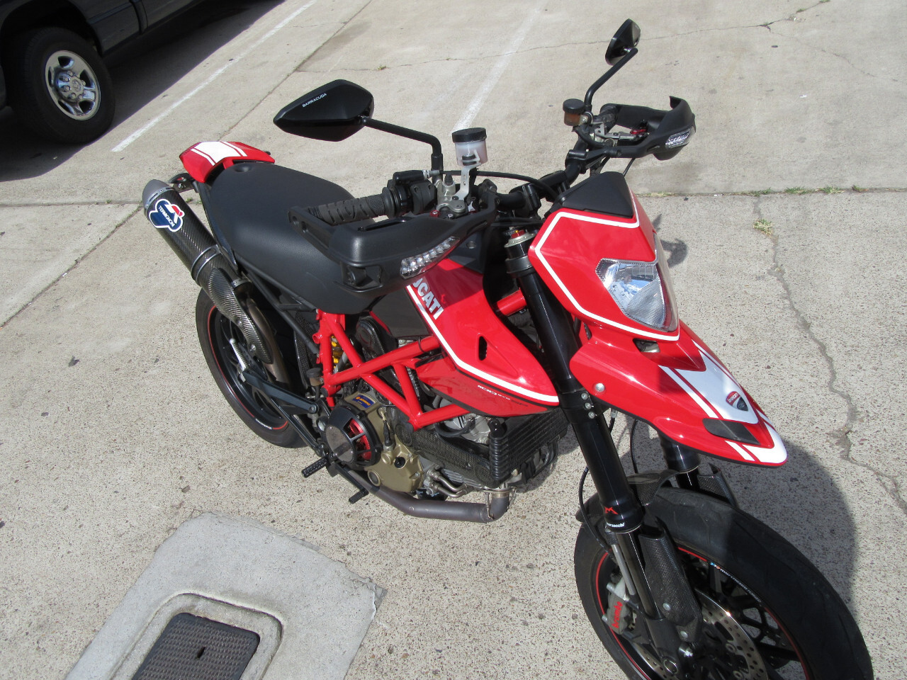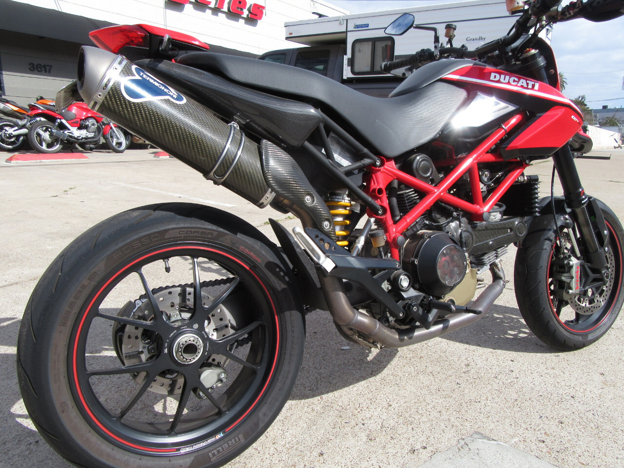 TERMIGNONI carbon fiber THUNDER, revised mirrors, LED signals, tail tidy, see-through clutch cover, carbon fiber trim, with huge Marzocchi forks, Ohlins rear shock, Marchesini forged wheels with just 10,441 original miles. 7,500 mile service completed at Moto Forza and very good condition. The Ducati Hypermotard 1100 EVO SP injects some real racing fervor into the Hypermotard concept: with higher ground clearance, top-spec suspension, higher bars. Ducati takes the whole Hypermotard concept to a higher level in Ducati style. High ground clearance, high spec suspension, new seat aesthetics and high bars make the 1100EVO SP track-ready for action in full red, white and black Ducati official colors.