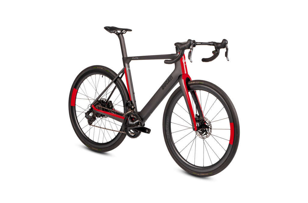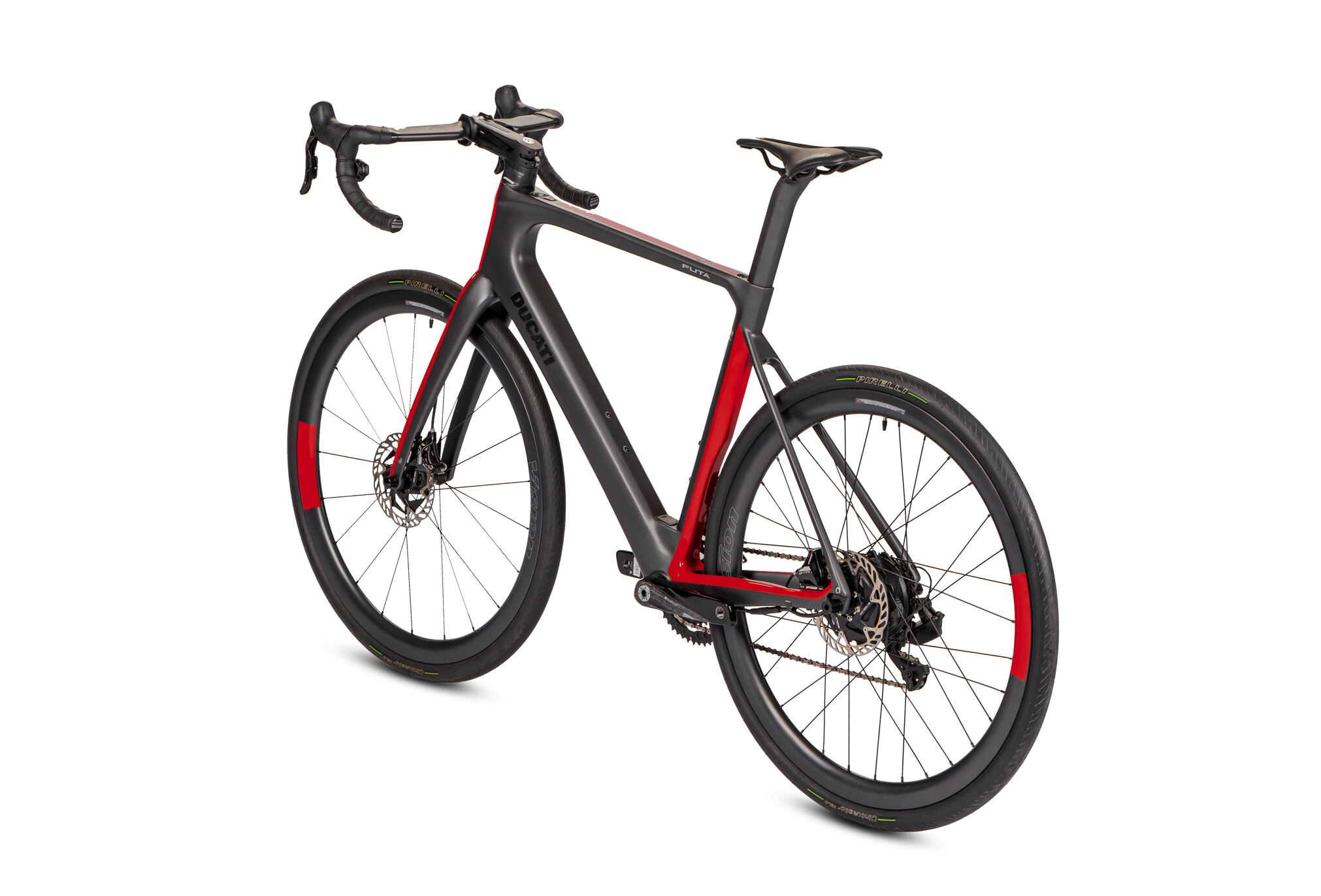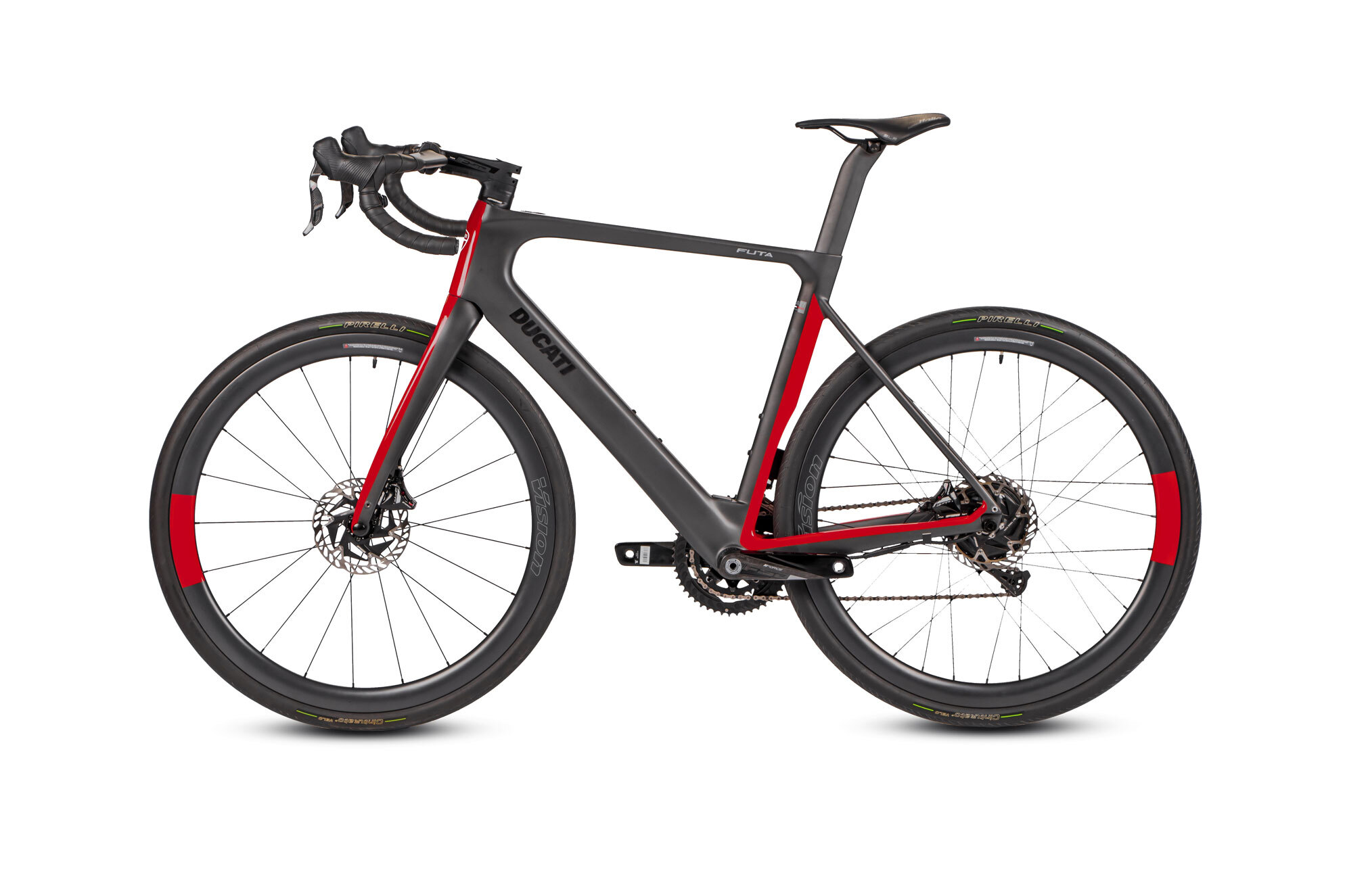 Was $8295 E-Road according to Ducati With the new FUTA, Ducati enters the E-Road segment: pedal-assisted road bikes. A name that is part of Ducati's DNA, in honor of the curves of the pass of the same name between Emilia Romagna and Tuscany, known and loved by all Ducatisti. A lightweight e-road that embodies the pure Ducati spirit by focusing on design, innovation and fun in a perfect combination of comfort and performance: a latest generation product developed to cover greater distances and gradients beyond your expectations. The carbon fiber monocoque frame has a sport endurance geometry, but with technical choices oriented towards aerodynamics and speed. The compact rear stay, with lowered sheaths, makes the bike comfortable, while generating less aerodynamic drag. The rear triangle is rigid laterally, precisely by virtue of the choice of the position of the sheaths and favours a better transmission of power to the wheel, as well as increasing the responsiveness of the bike. Down tube, seat post and fork sliders are expertly profiled and their reliefs are highlighted by the play of colors of the livery which sees grey and black as the main colors with accents in Ducati Red.