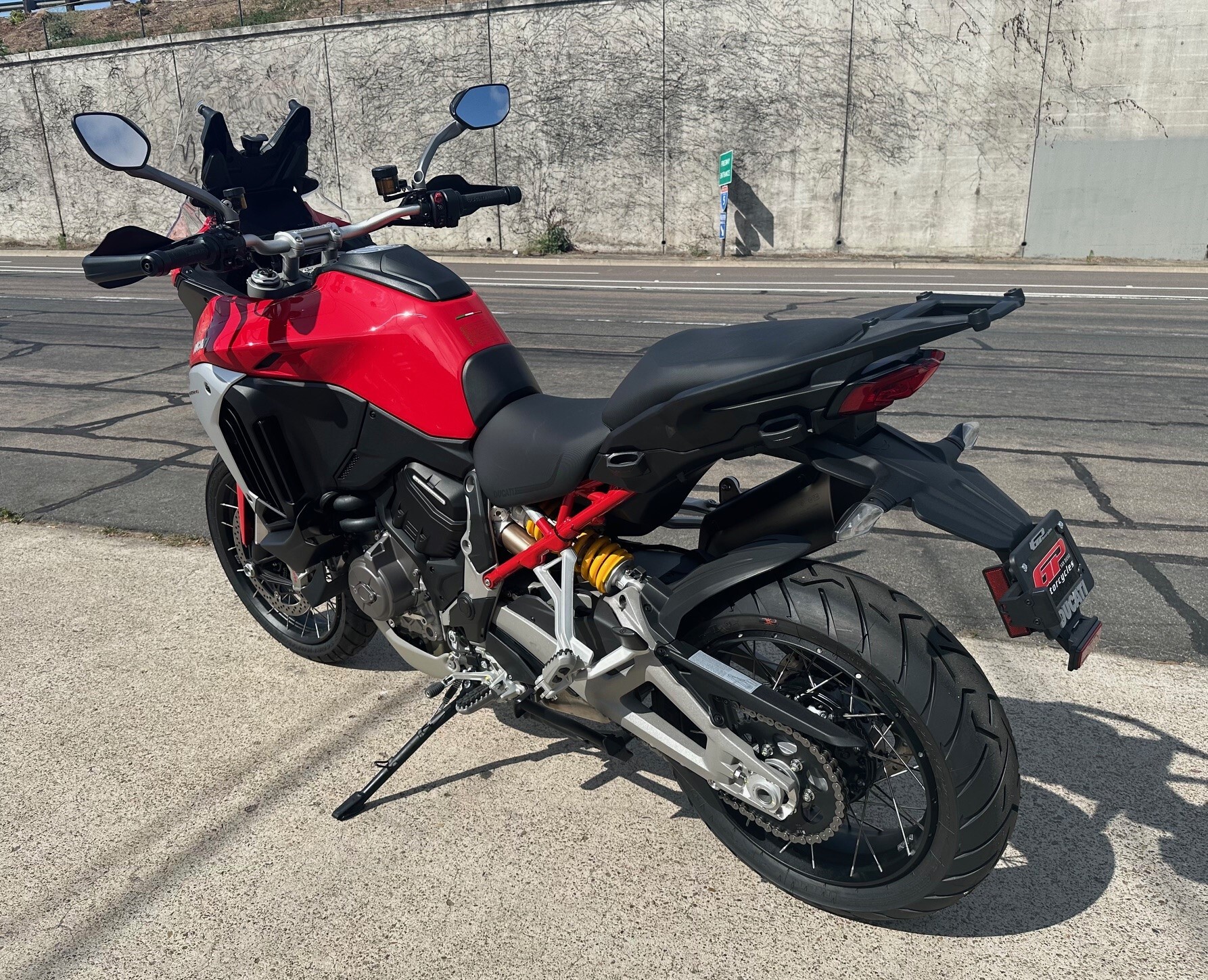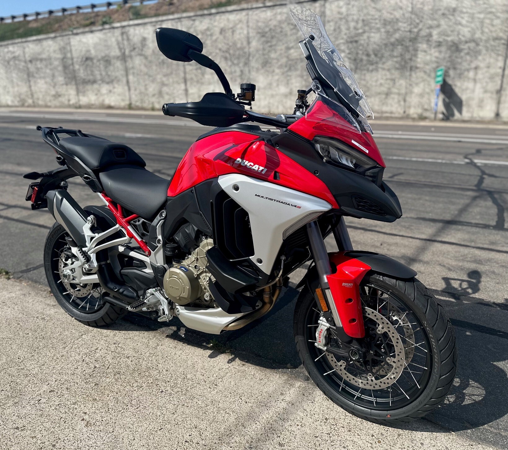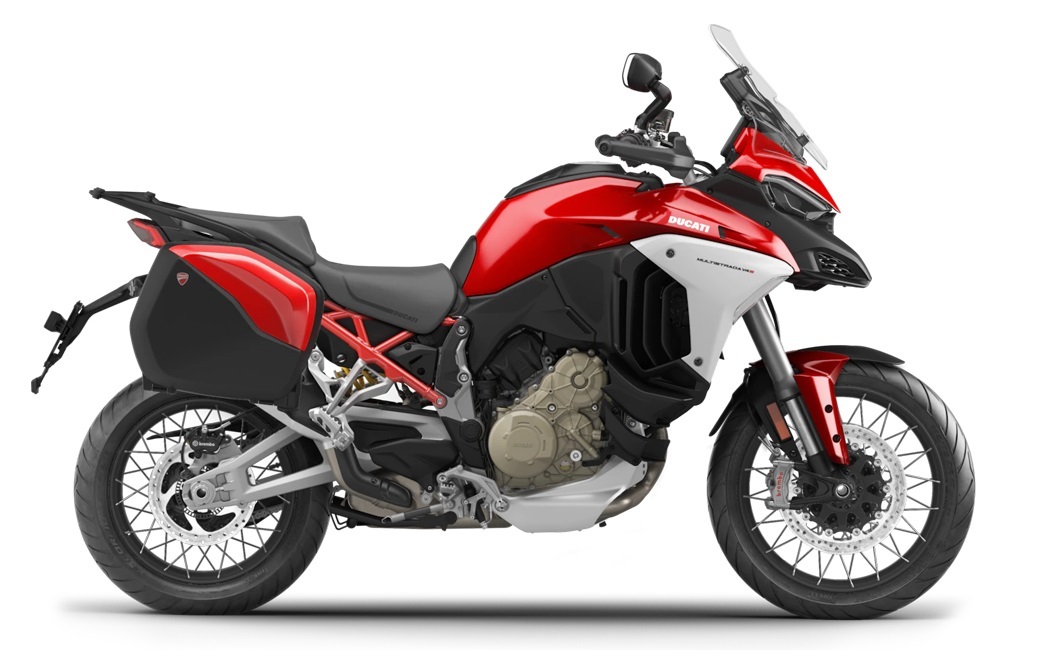 The Multistrada V4 S comes standard with the Travel & Radar package which includes Rigid Side Panniers, Blind Spot Detection, and Adaptive Cruise Control.
