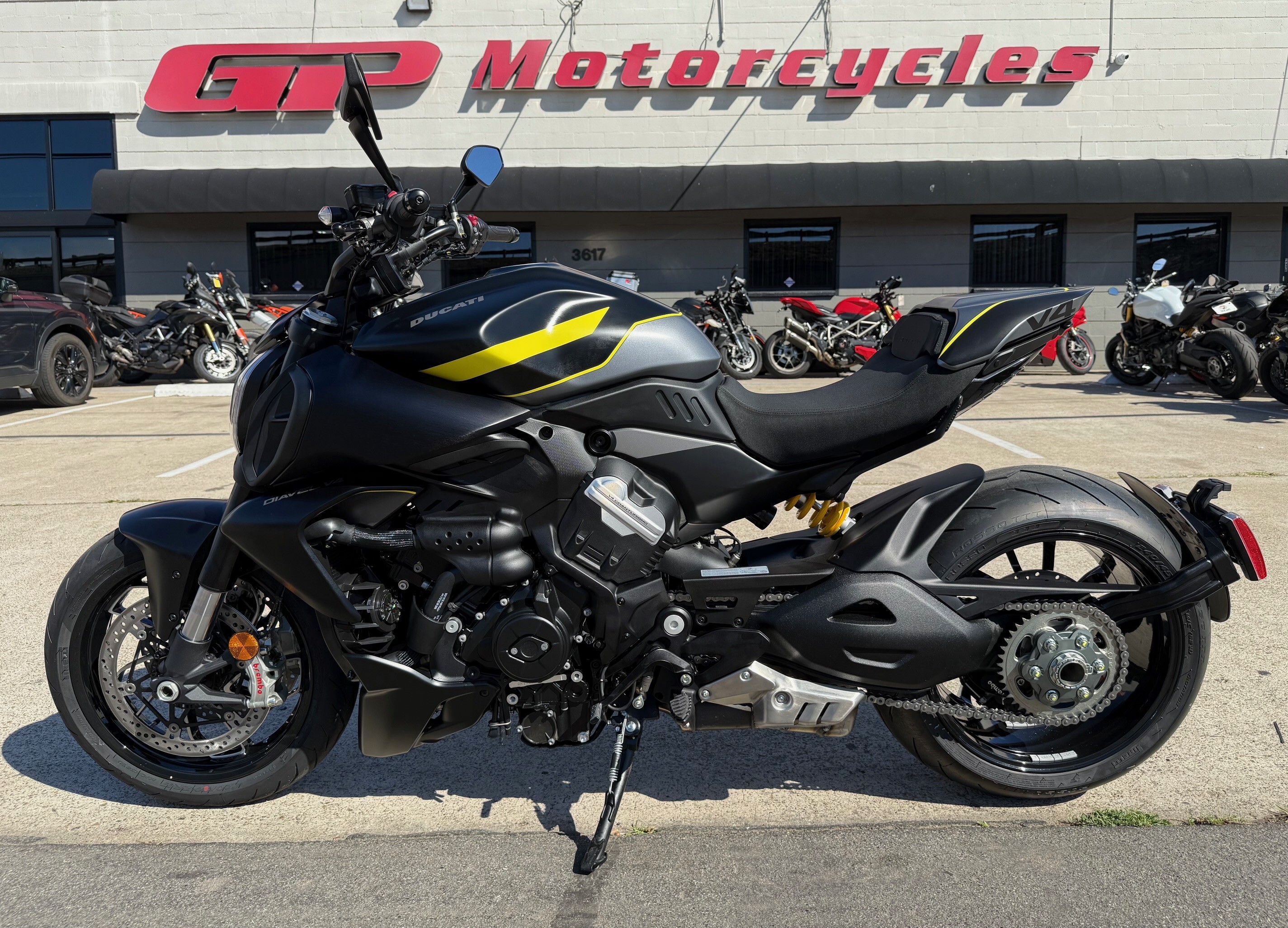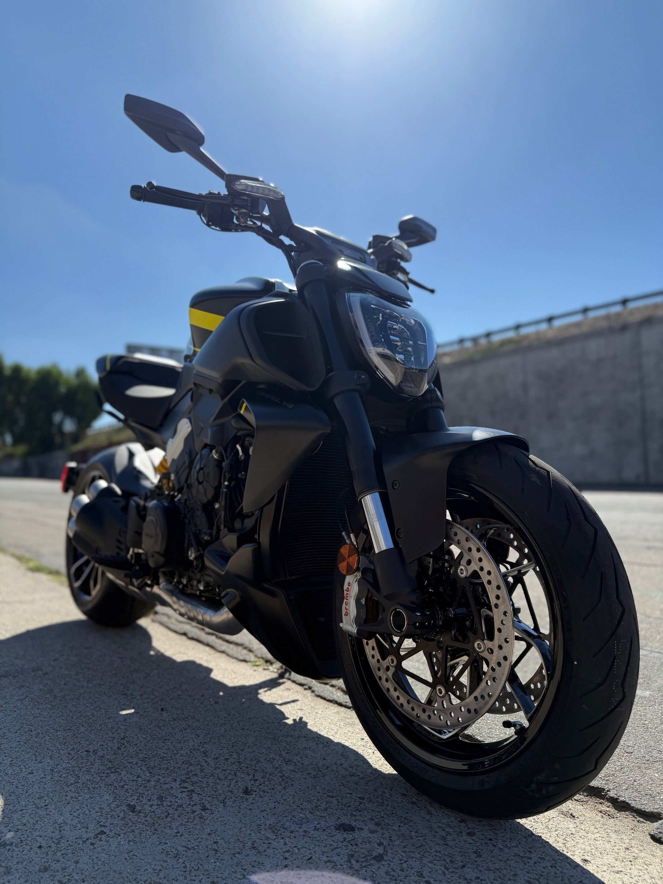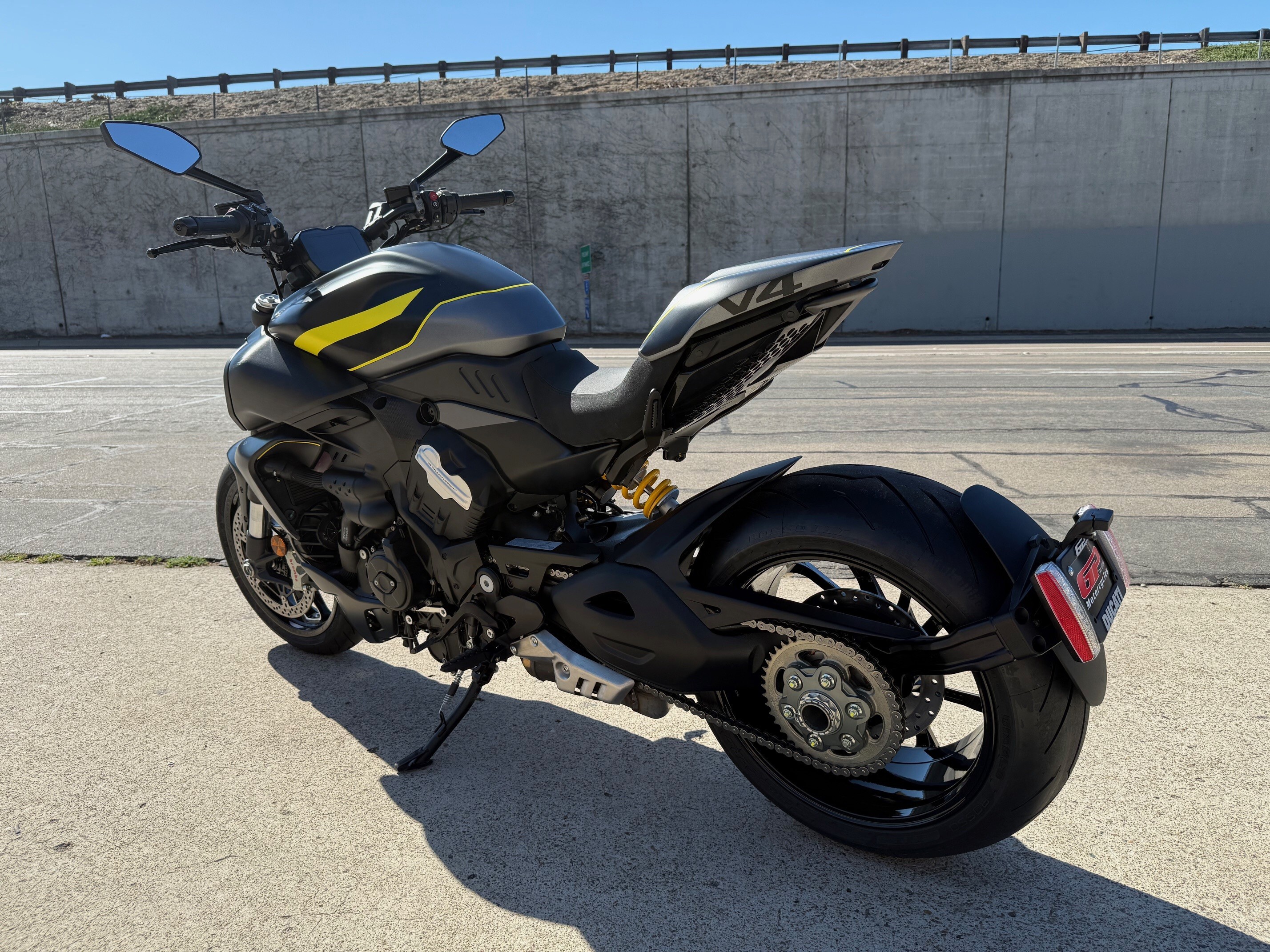 The V4 Granturismo takes center stage on our muscle bike and allows it to express its personality to the fullest. Ducati's four-cylinder engine guarantees high performance, combined with smoothness and regularity, at every rpm. The new chassis combines ideally with what have always been the Diavel's strengths, such as its characteristic riding position and comfort in medium-range touring. In addition, thanks to a major weight reduction, handling and agility improve noticeably.