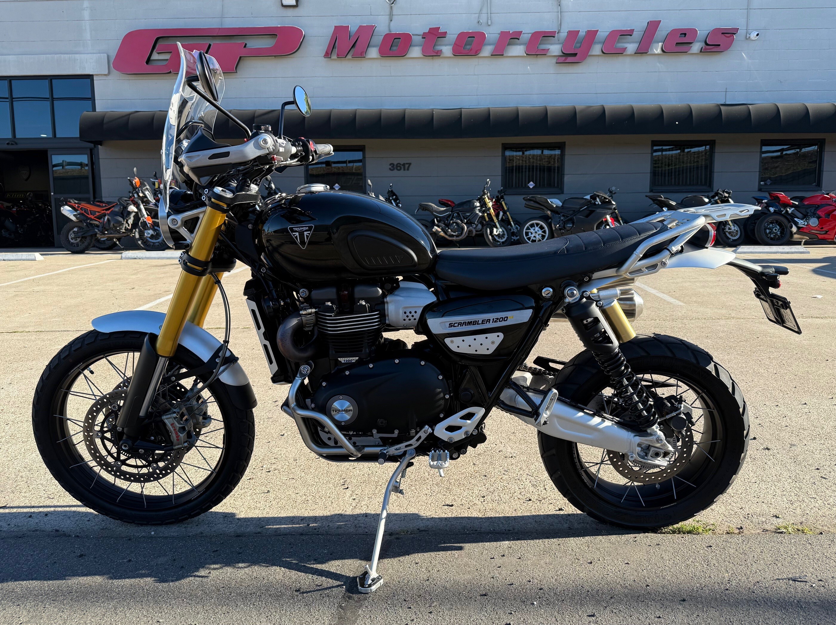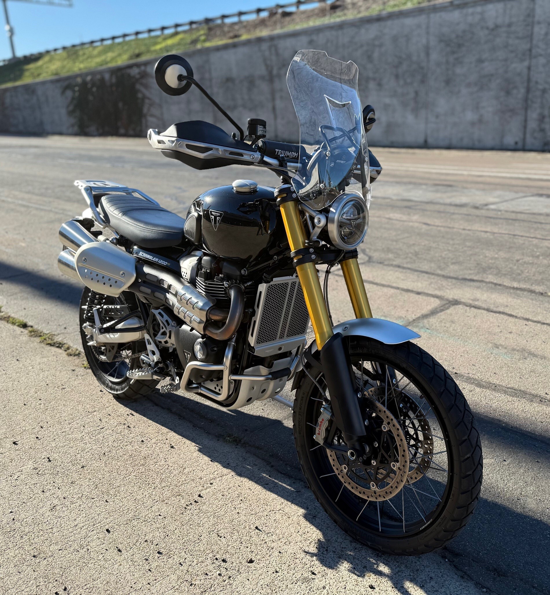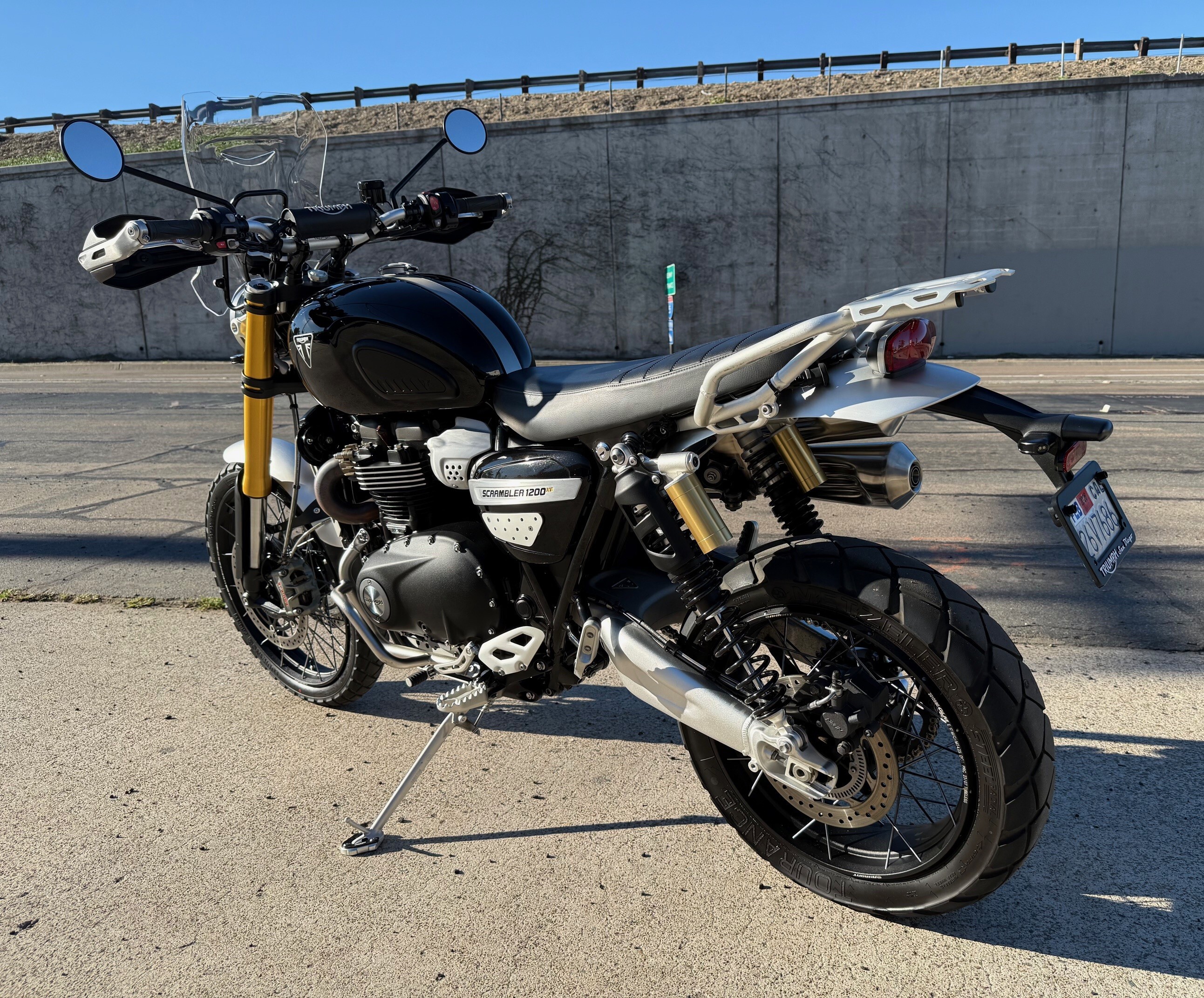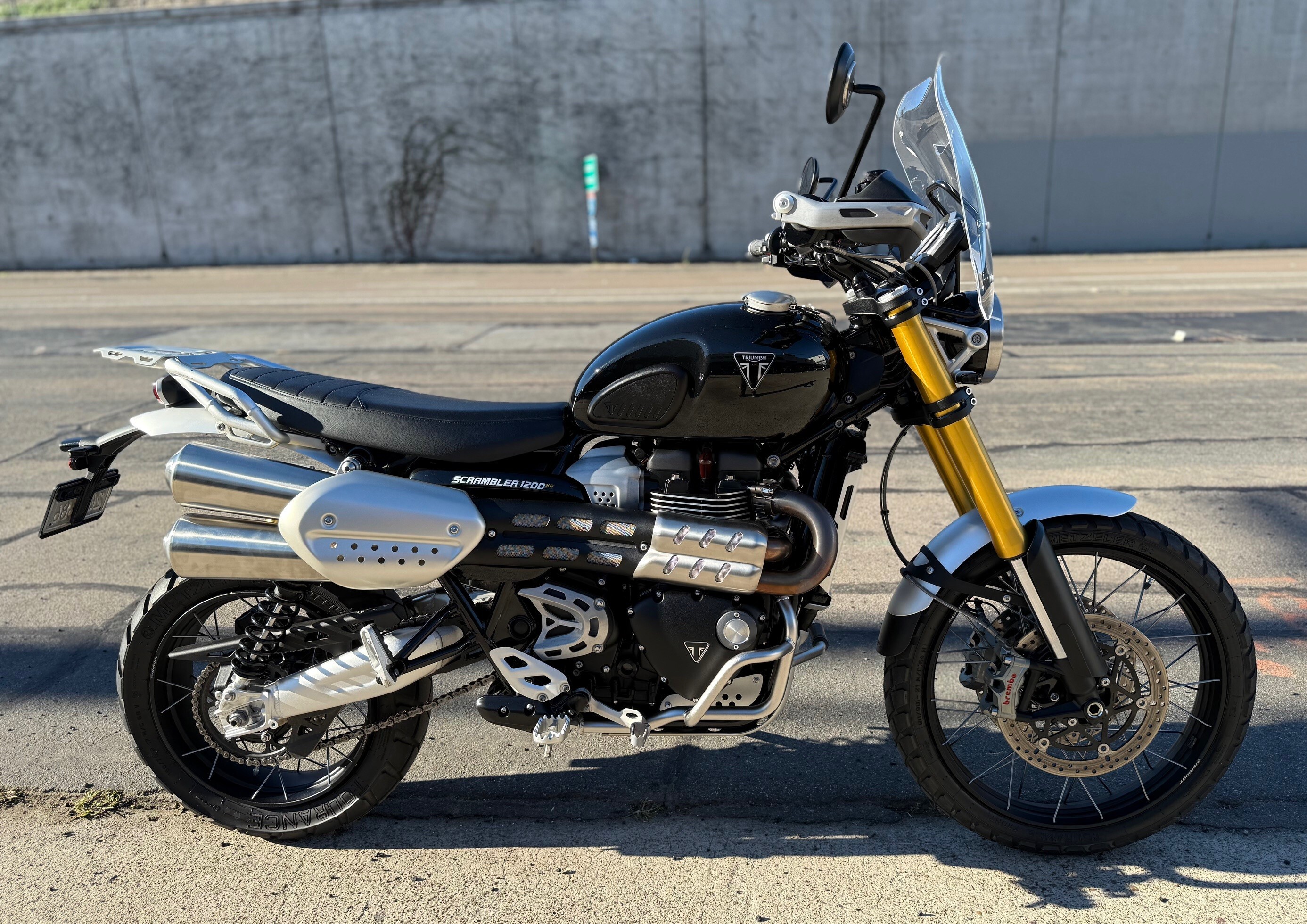The 2024 Triumph Scrambler 1200 XE is a premium adventure-styled motorcycle with a powerful 1200cc parallel-twin engine (89hp/81.1ft-lbs torque), long-travel, fully adjustable Marzocchi suspension (9.8 inches), high-spec Brembo Stylema brakes, a taller 34.25-inch seat height, and advanced rider tech like cornering ABS/Traction Control and multiple riding modes, including Off-Road Pro, distinguishing it with superior off-road capability and components over the standard Scrambler 1200 X. This bike is in great shape and has added windscreen for more comfort.