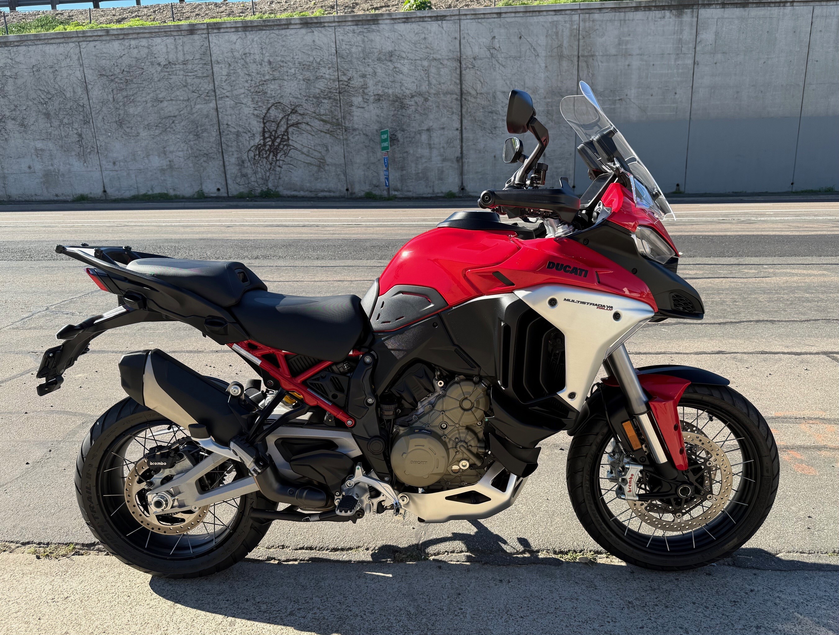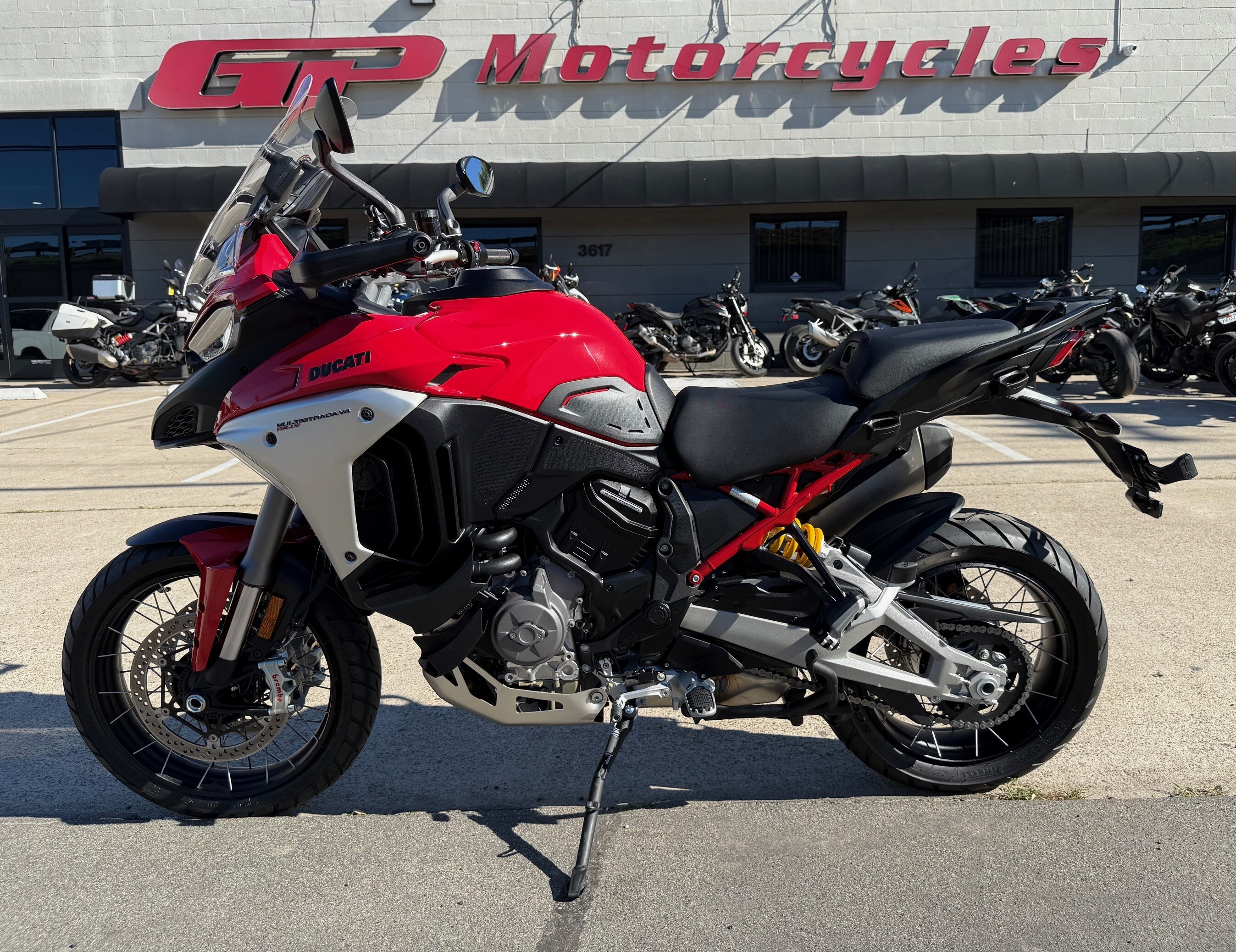 This bike looks like brand new. The side bags and rack are included and still in the box as they were never installed. Bought brand new at GP Motorcycles. First service was performed at GP. The 2025 Ducati Multistrada V4 Rally is an extreme adventure tourer with a 170hp 1158cc V4 Granturismo engine, featuring extended-travel adaptive Skyhook suspension (DSS EVO) for 200mm travel, an 8-gallon fuel tank, spoked wheels, and advanced tech like radar-assisted Cruise Control and Blind Spot Detection, built for comfort and capability on any terrain with its long service intervals and rugged design. Power: 170 hp @ 10,750 rpm. Torque: 91 lb-ft @ 9,000 rpm. Transmission: 6-speed with Ducati Quick Shift (DQS) up/down. Frame: Aluminum monocoque. Front Suspension: Marzocchi Ø 50 mm USD fork, fully adjustable, Adaptive Skyhook Suspension (DSS EVO). Rear Suspension: Fully adjustable monoshock with Skyhook, includes automatic fast lowering. Travel: 200mm front and rear (increased travel). Wheels: Spoked, 19" front, 17" rear. Tires: Pirelli Scorpion Trail II (120/70 R19 front). Adaptive Cruise Control (ACC) & Blind Spot Detection (BSD): Radar-based systems for enhanced safety. Comfort: Heated grips and seats Off-Road Mode: 115 hp power mode for better control. Valve maintenance every 37,000 miles