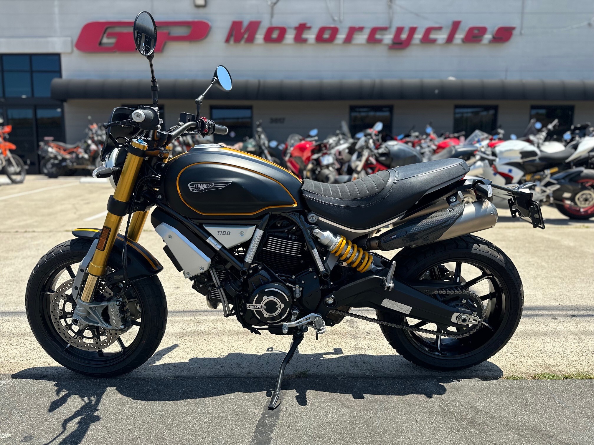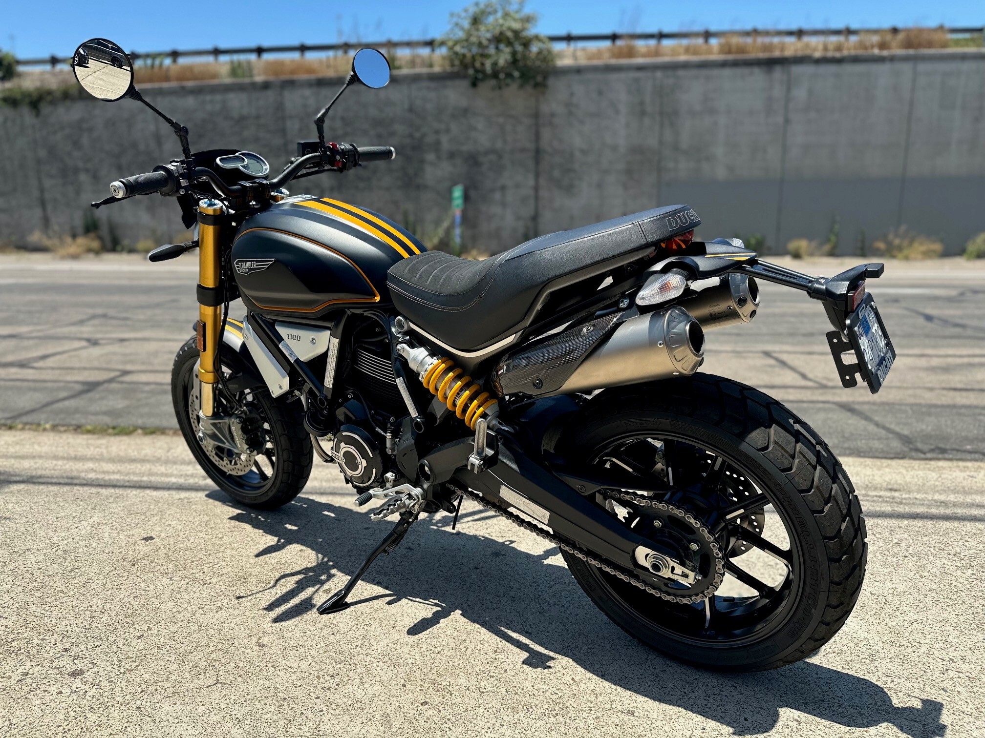 This DUCATI Scrambler Sport Pro was purchased new at GP Motorcycles. Akro slip on included. This Sport Pro is equipped with Öhlins suspension. Its engine’s a 1,079-cc, two-valve, air/oil-cooled, 90-degree L-twin from the Monster 1100 Evo. The 1100 Sport comes in “Viper Black” with yellow tank sides and dual yellow striping down the middle of the tank and mudguards. It also features aluminum wheels with machine-finished spokes, tapered handlebars and a seat with a dedicated lining. One notable new safety aspect casual riders will like, too, is its lean-angle sensitive traction control and antilock brakes.
