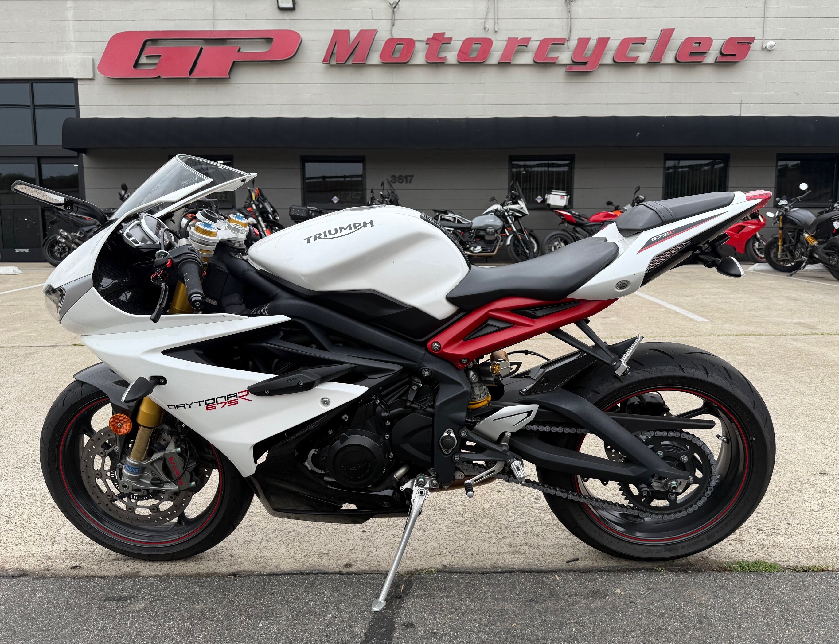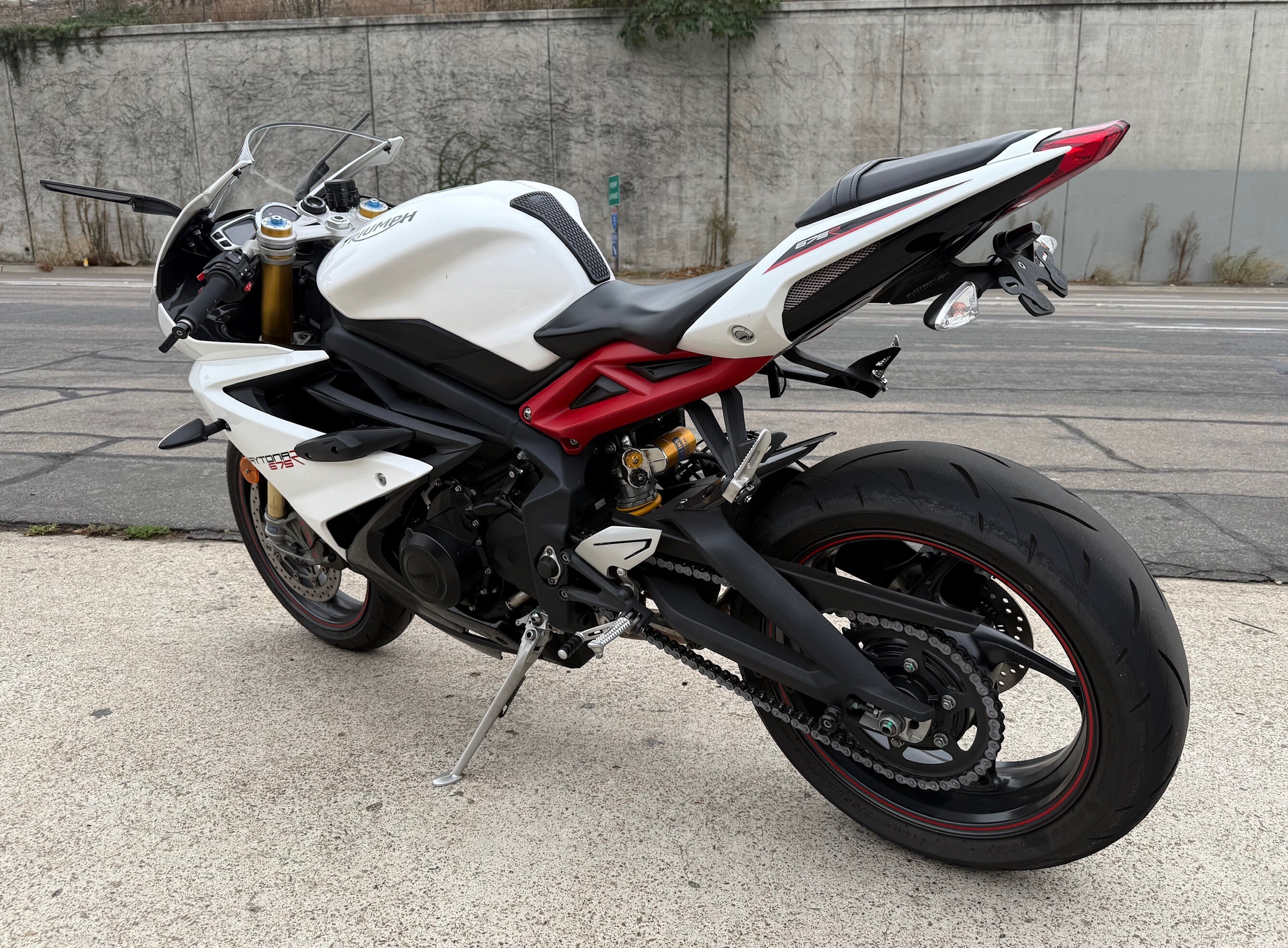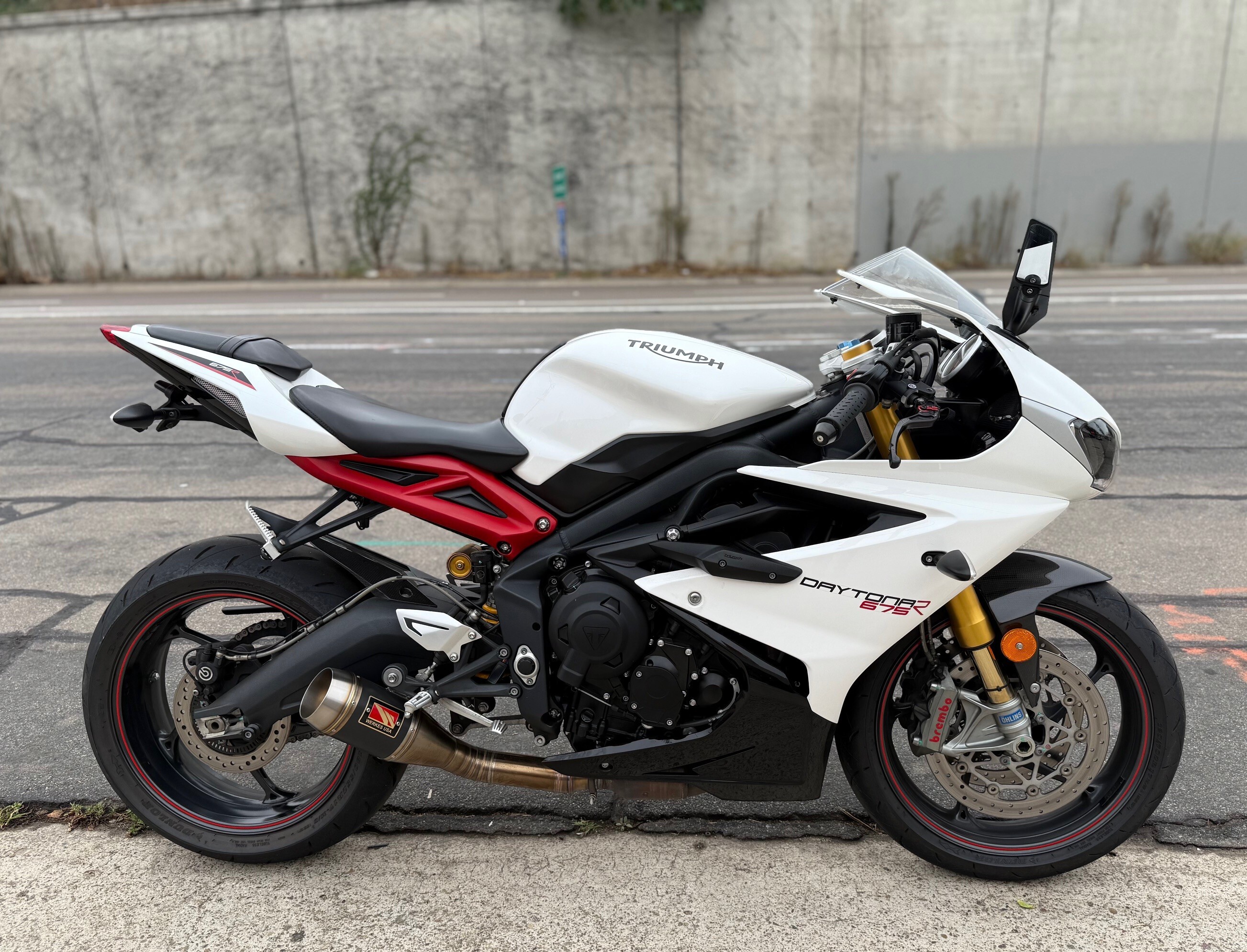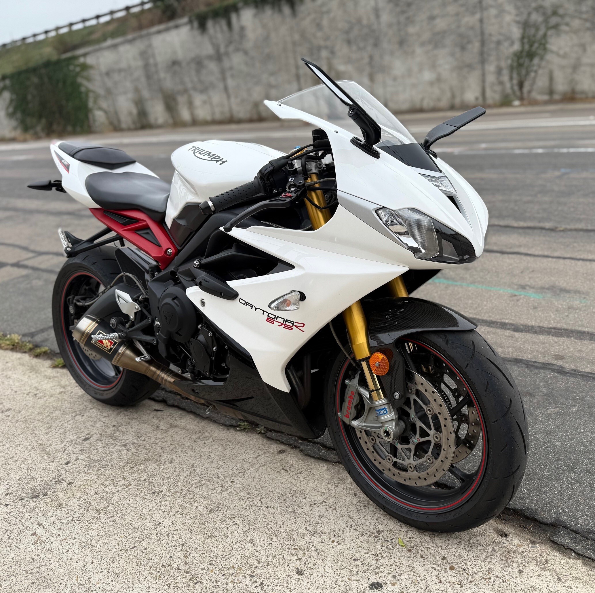 The 2016 Triumph Daytona 675 R features a 675cc in-line three-cylinder engine with 128 hp and 55 ft-lbs of torque, Öhlins suspension, Brembo brakes with switchable ABS, and a 6-speed transmission with a slipper clutch. It also includes a carbon fiber cockpit and mudguards. Great condition. Tail Tidy, CRG levers and blade mirrors have been added.