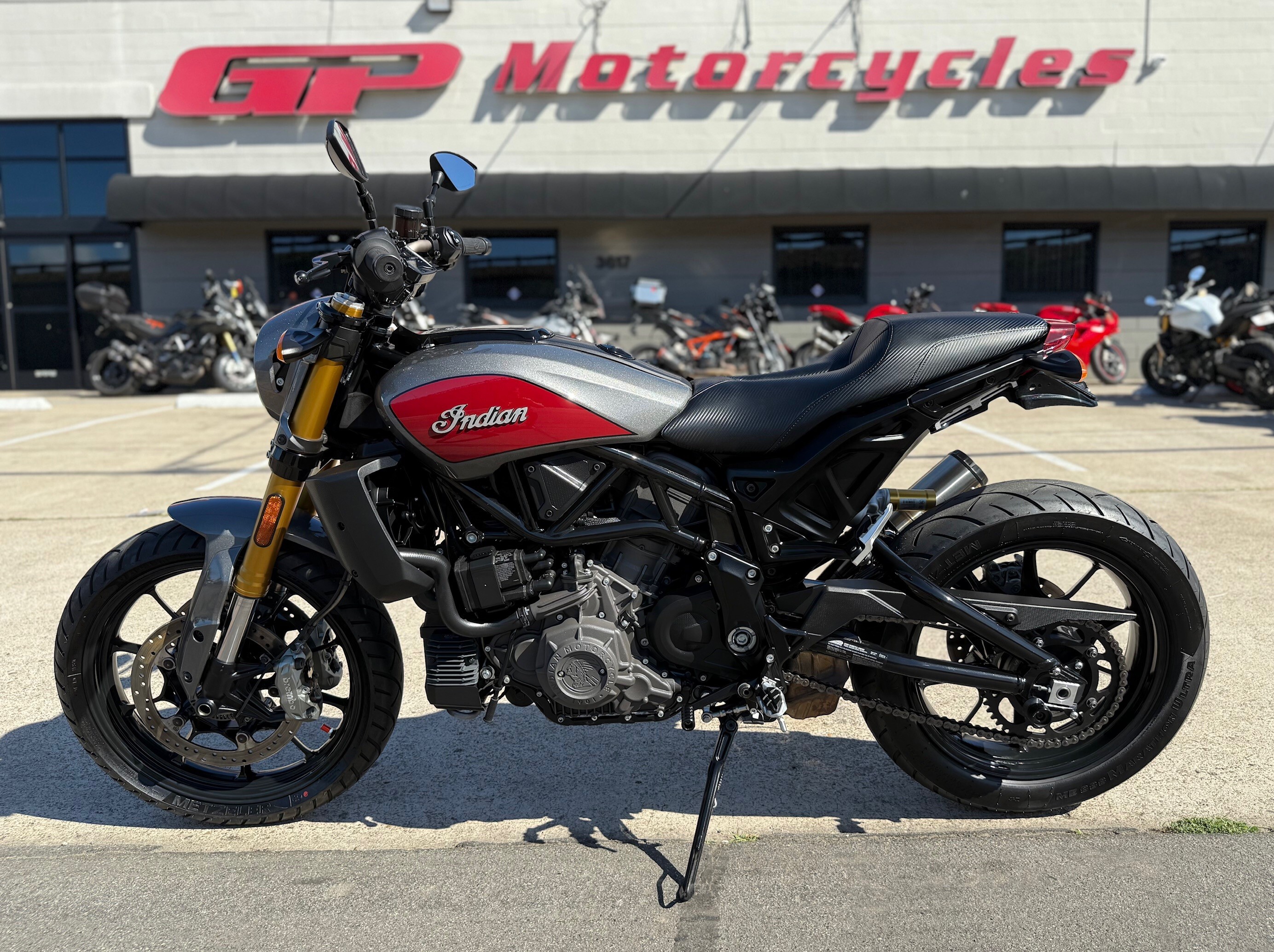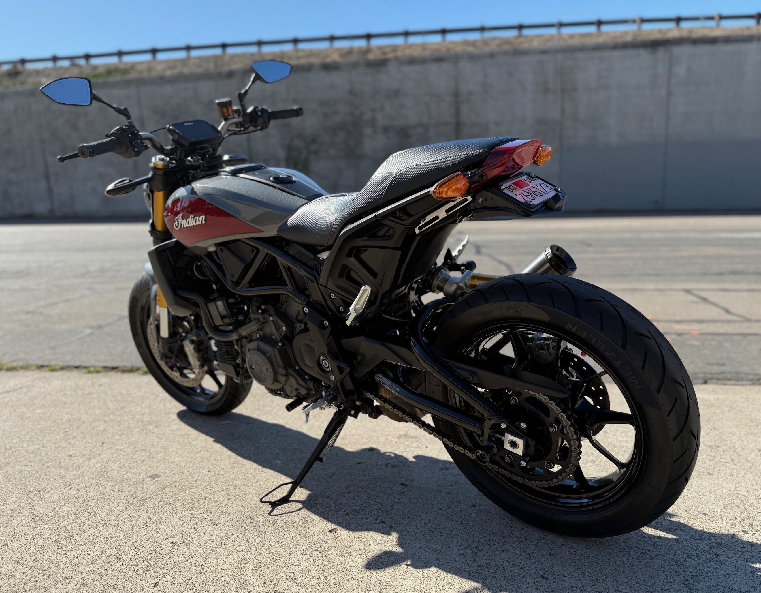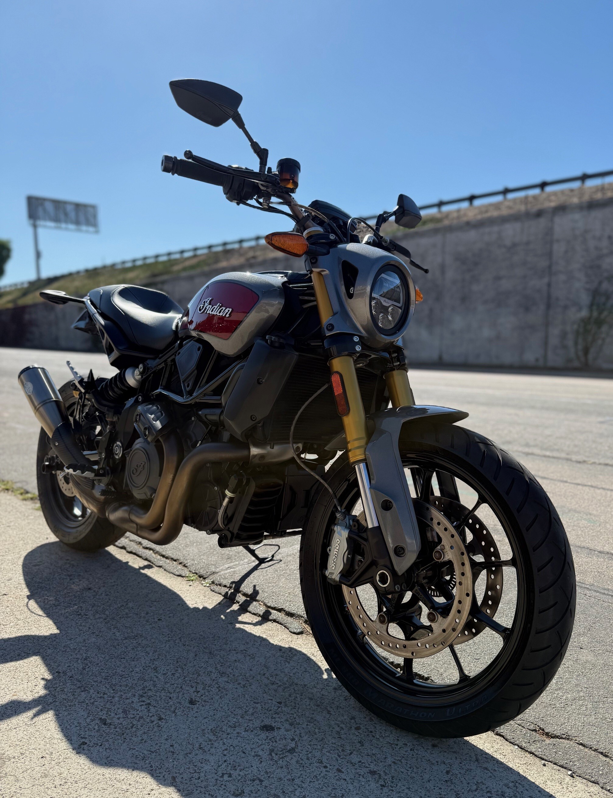 This is in great condition. Nice sounds and comfortable seat are included. The 2019 Indian FTR 1200 S is powered by a 1203cc liquid-cooled V-twin engine that produces 123 hp and 87 lb-ft of torque. It features a steel trellis frame, fully adjustable front and rear Sachs suspension, and a 4.3-inch Ride Command color touchscreen with Bluetooth. The bike has Brembo-style brakes with Bosch Cornering ABS, a 6-speed transmission with a slipper clutch, and a 3.4-gallon fuel tank.