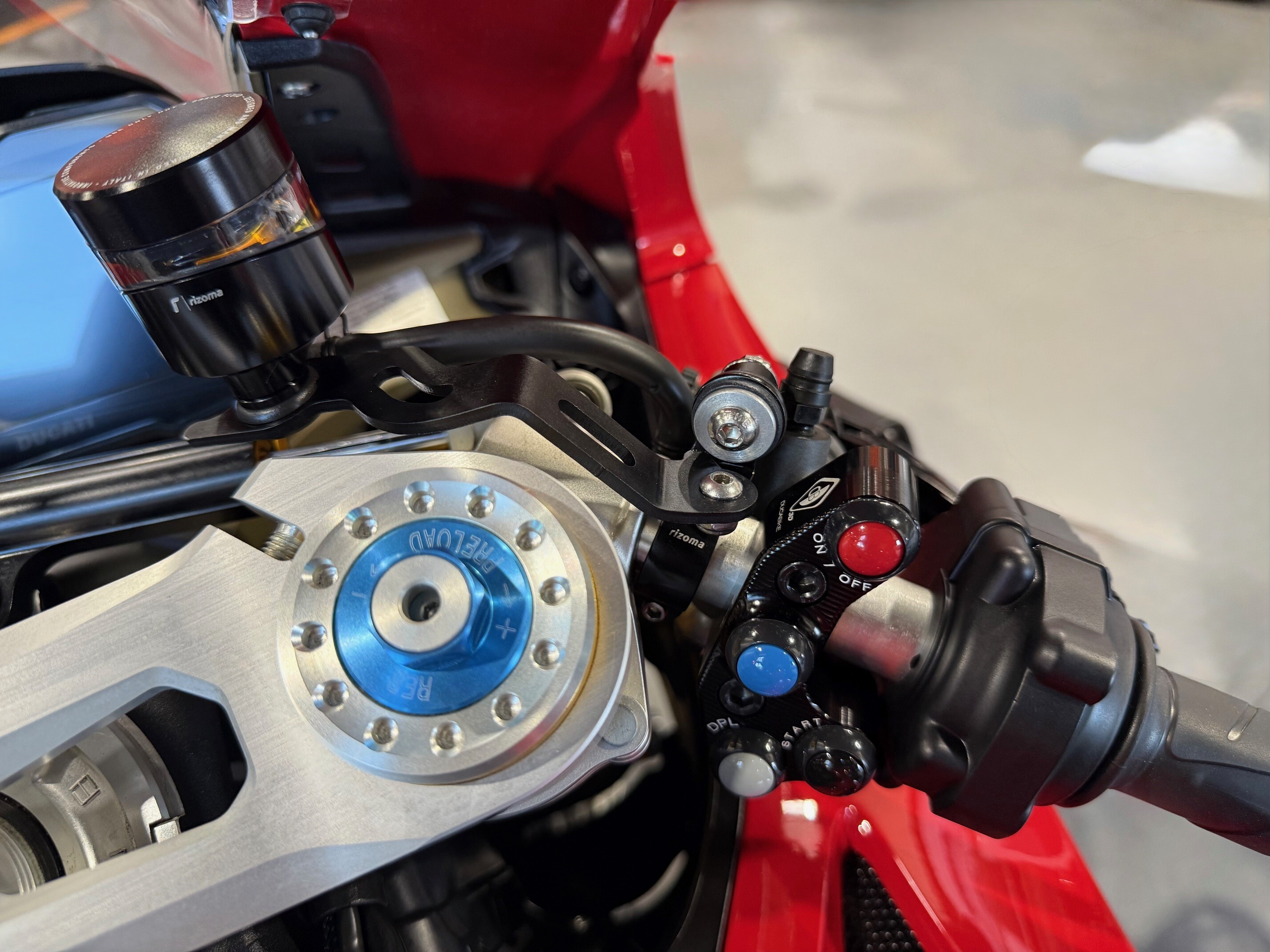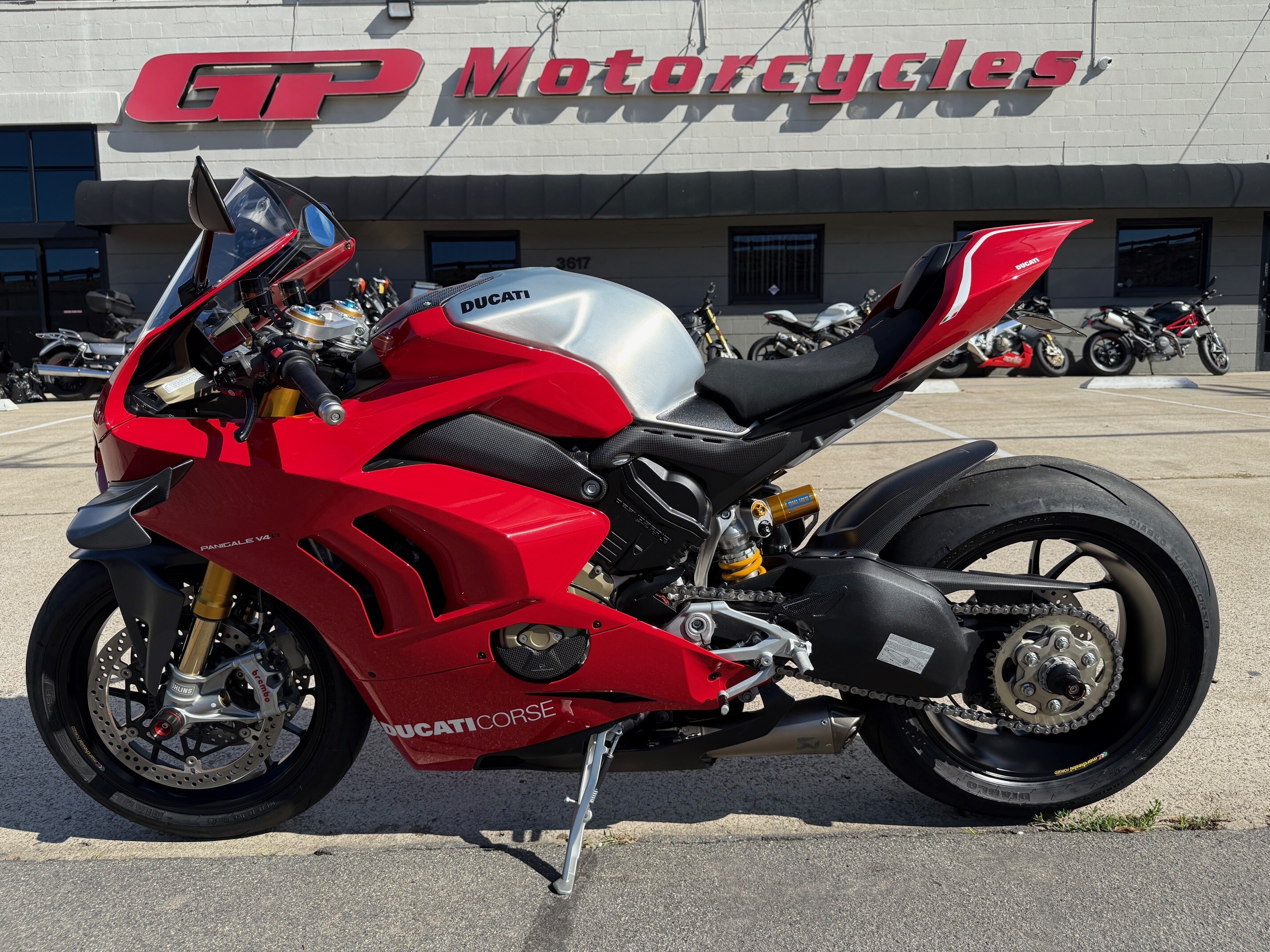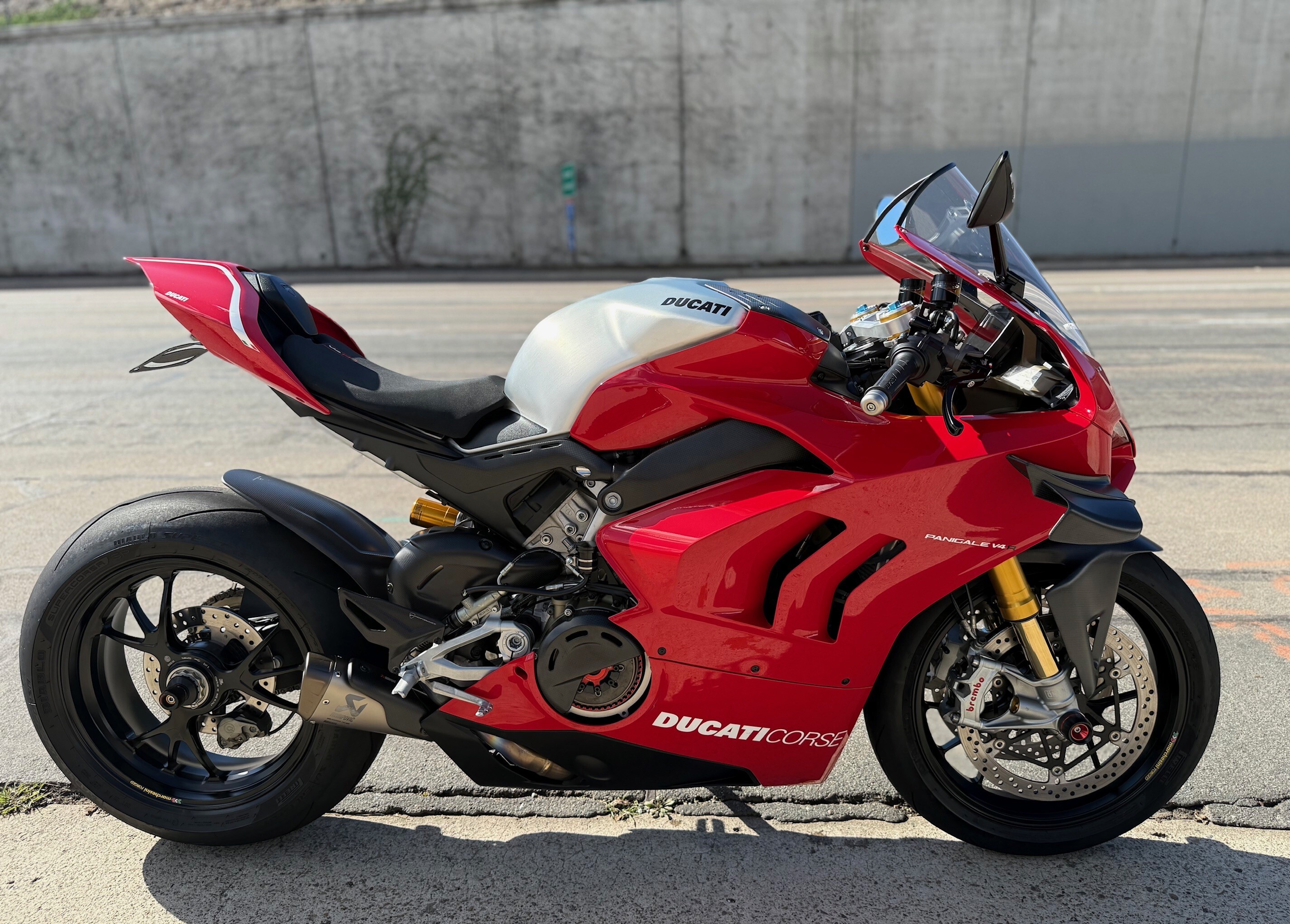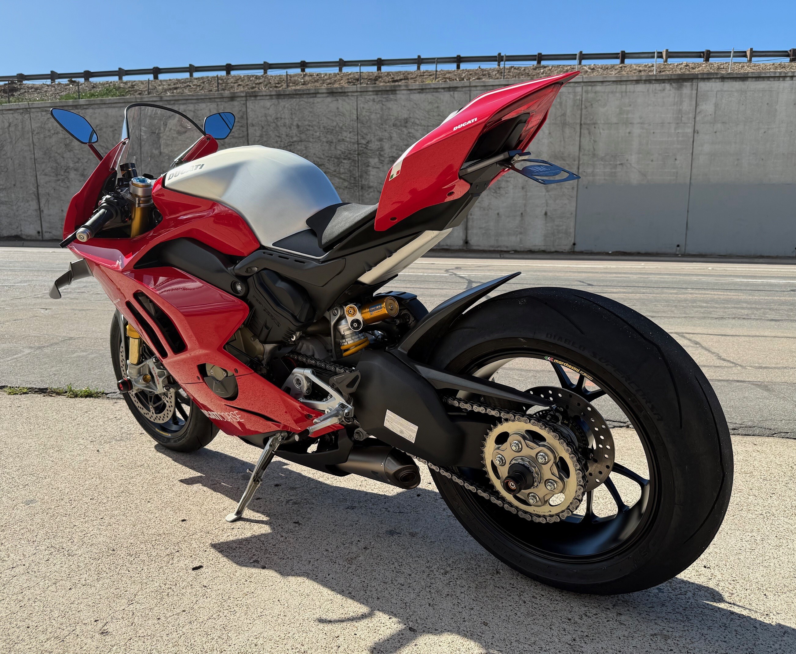 This excellent condition, pre-loved V4R with 3351 miles was just traded in. The 2019 Panigale V4 R is a 998cc street-legal superbike stunner with 221 horsepower, up-spec racing suspension and winglets. Built to win World Superbike Races and Championships. The bike has not been crashed or dropped. This bike was owned by a mature owner, who bought it new at GP Motorcycles. The bike will come with 2 keys. The engine is a 998cc, Desmosedici Stradale R unit, a smaller, but more powerful mill rated at 221 horsepower and 83 lb-ft of torque for a dry weight of only 379 lb (versus 214 hp and 384 lb for the standard 1-liter V4). This bike has the optional Ducati Performance racing Akrapovič exhaust which takes the R to 234 hp and sheds over 10 pounds. These numbers give the Panigale V4 R the ultimate title of most powerful production Ducati ever built to that point. Other extras on the bike includes: RCS Brake master cylinder, RCS Clutch master, with Rizoma reservoirs, Axle Sliders, Tail Tidy, Full Akro Ti system, Carbon rear fender, carbon ignition cover, carbon heal guards, carbon clutch cover with red STM clutch basket, carbon tank cover, carbon key guard, carbon frame covers, carbon subframe covers, Radiator/oil cooler guards, Ducabike right hand billet switches and Rizoma mirrors.